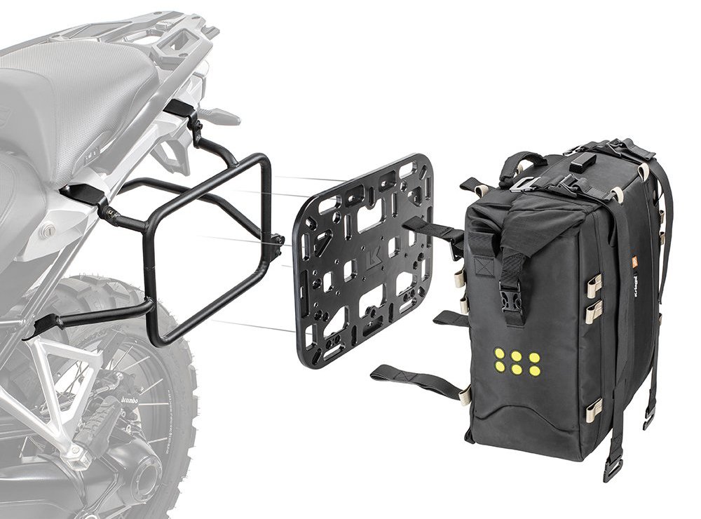 A virtually indestructible OS-PLATFORM bolts-on to an OEM or aftermarket side pannier rack to provide a mounting platform for a choice of OS-SOFT PANNIERS.