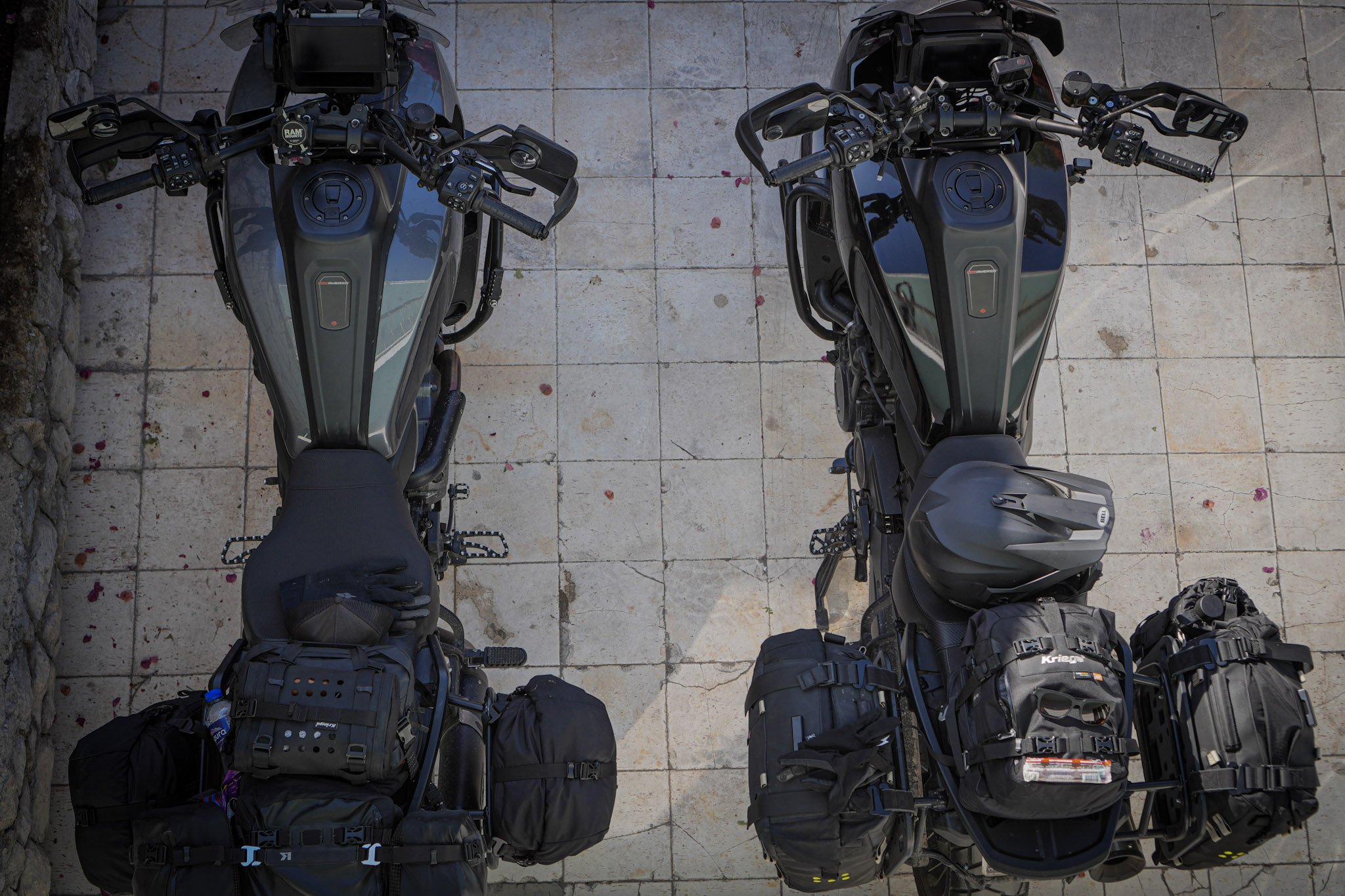 On Angel’s bike we mounted OS Platforms to the factory racks [Kriega designed special OS Platforms for H-D Pan Americas], then hung OS Soft Panniers from them: OS-22 on the exhaust side, and OS-32 on the other. He added a US-10 Drypack to the tail, and an OS-Bottle for easy water access.
